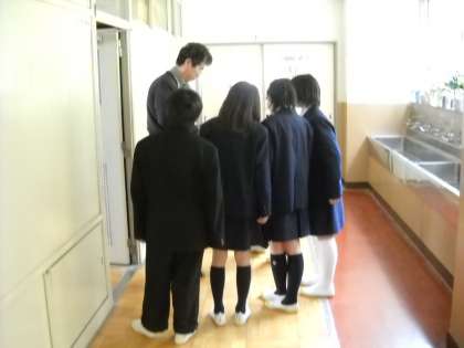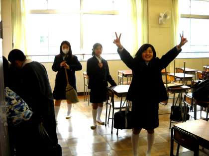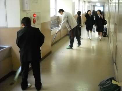 高野先生も生徒と一緒に箒(ほうき)を持ってお勤めです。