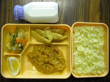 ターメリックライス・チリコンカンカン・トリーポテト・フレンチサラダ・果物