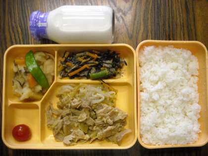 ごはん・韓国風焼肉・ボイルもやし・ひじきの和風サラダ・新じゃがの煮つけ・