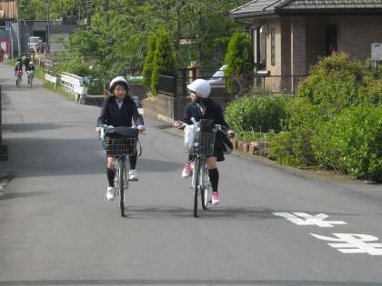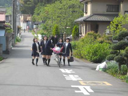学校の前の道は生徒で一杯です。