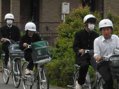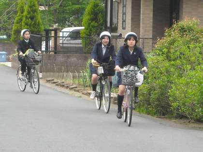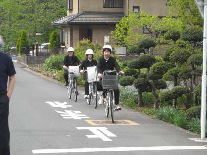 自転車は1列で広がらないように走りましょう。