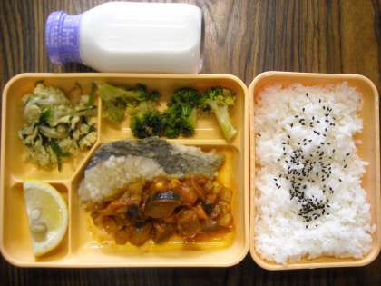 ごまごはん・白身魚のはっちソース・ブロッコリーのおかか和え・ニラ玉炒め・果物