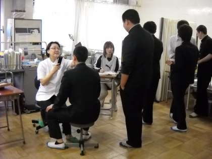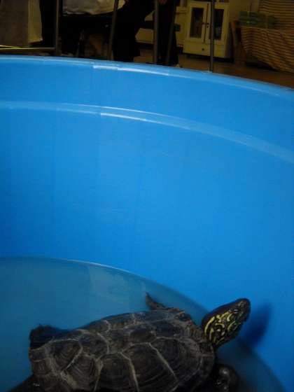 カメのグッさんが見守る中、てきぱきと検診が進みます。