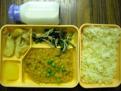 ターメリックライス・ドライカレー・青菜のナムル・じゃが芋のペイザン風・果物