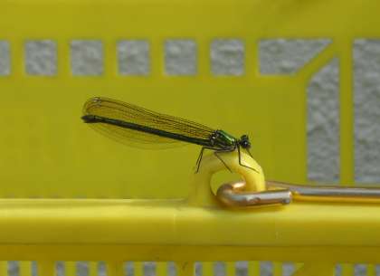 玉虫色の美しいトンボが、保健室前の黄色いカゴにとまっていました。