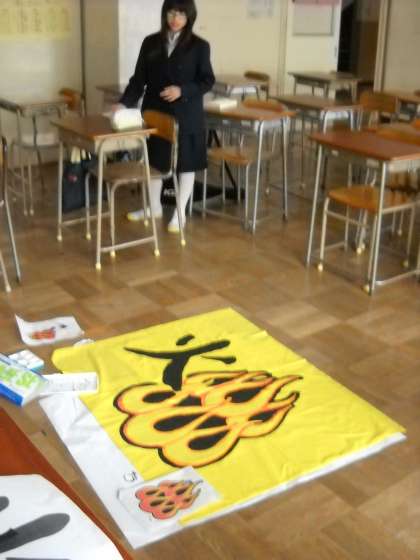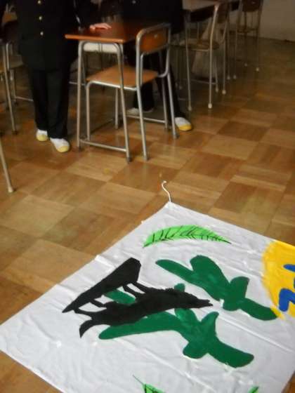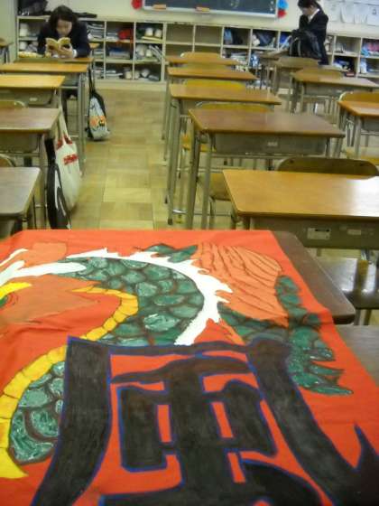 各教室には、制作途中の垂れ幕や応援旗が置かれていました。