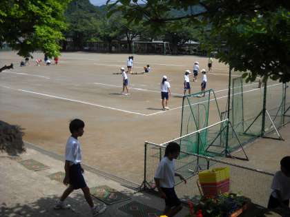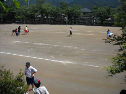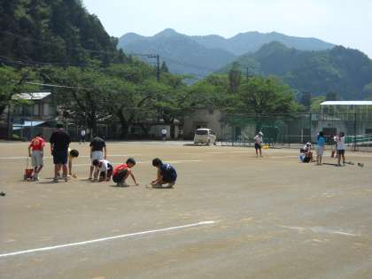 明日恩中で開催される大会に備えて、コートづくりをしていました。