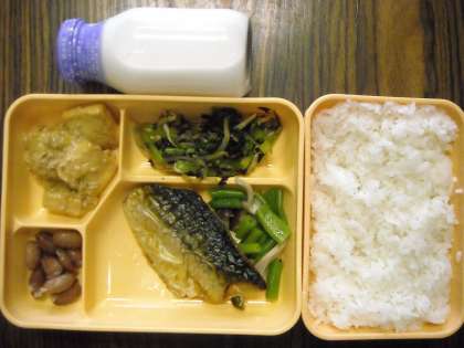 ごはん・鯖の塩焼き・いんげんとしめじのソテー・野菜ののり和え・厚揚げの中華煮・