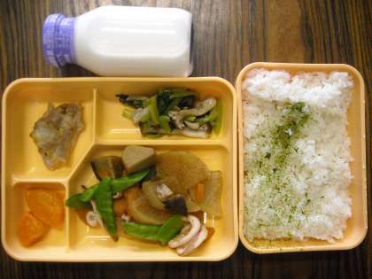 磯香ごはん・いかと野菜の煮物・小松菜としめじの塩炒め・鶏肉の七味焼き・