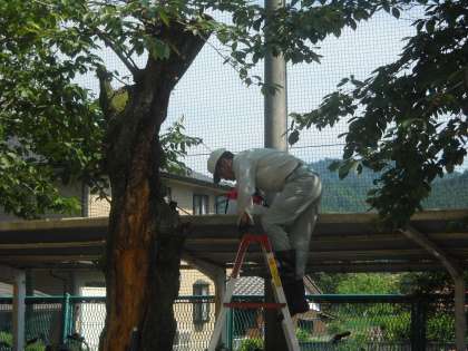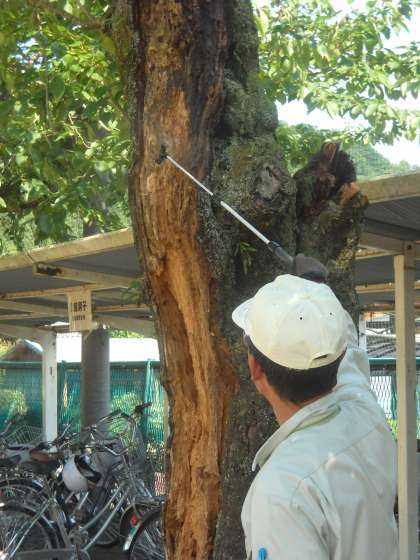 午後から用務主事の秋山さんが、消毒液を散布しました。