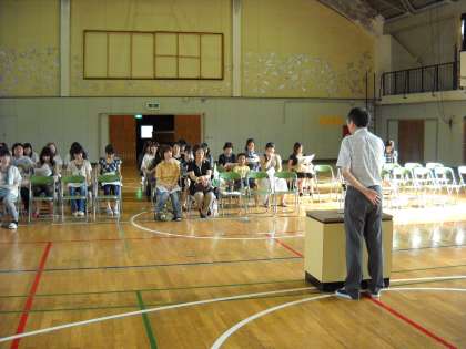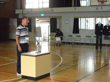 新スクールユニフォーム採用などのお話の後、粕谷先生から一学期を振り返っての課題などの報告や諸連絡がありました。