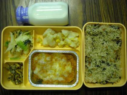 ひじきピラフ・かぼちゃのミートグラタン・コーンポテト・キャベツのツナマヨ和え・ごまめナッツ
