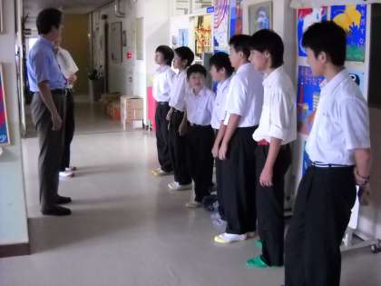 一度玄関に集まって、ミーティングをしていました。
