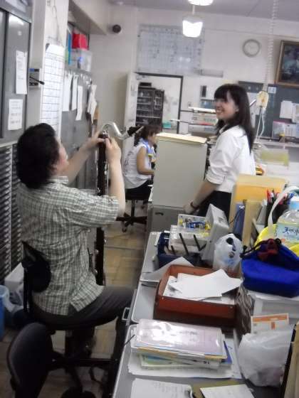 全体での音合わせの前に、顧問の竹信先生がバスクラリネットの修理をしていました。