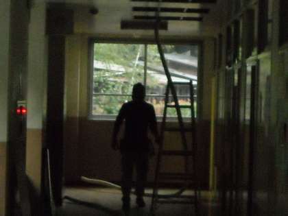 教室のエアコンにダクトを取り付ける作業が始まりました。