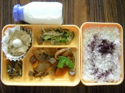 ゆかりごはん・いかと野菜の煮物・きゅうりのナムル・お月見しゅうまい・ごまめナッツ