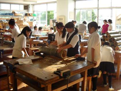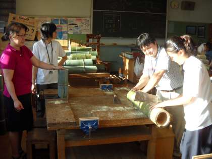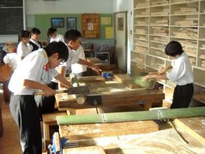 放課後、木工室では係生徒が、炊飯用の竹を切断していました。