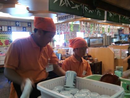 独楽寿司では、忙しいランチが終わり、お皿ふきをしていました。