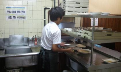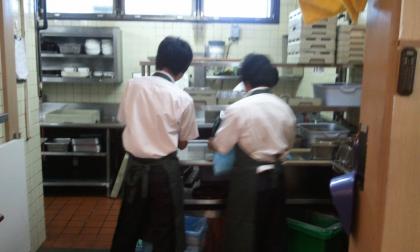 3人で食器洗い中です。ホールのテーブル拭きなども任されて頑張っています。