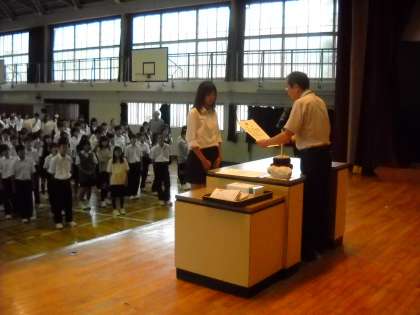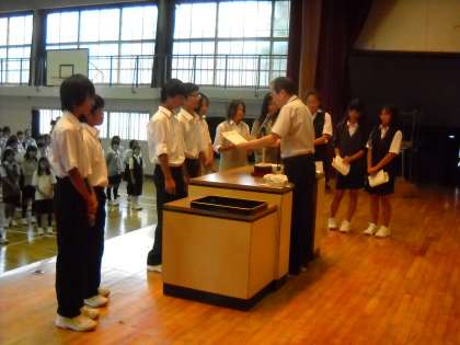 夏休みに行われた連合水泳大会優勝と、18日に恩方中で行われたソフトテニス部1年生研修大会の優勝など入賞者多数の表彰でした。
