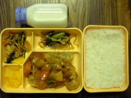 ごはん・白身魚の酢豚風・野菜のからし和え・豚キムチ・果物