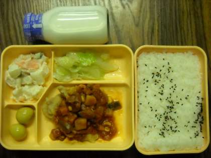 ごまごはん・鶏肉のはっちソース・キャベツの辛味炒め・ポテトサラダ・うずら卵のカレー煮