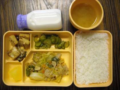 ごはん・ホイコーロー・きゅうりの南蛮漬け・厚揚げの煮物・果物・味噌汁
