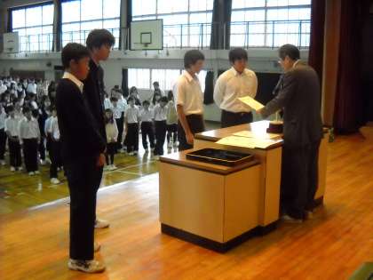 最後ににソフトテニス部男子の、秋の大会の表彰がありました。