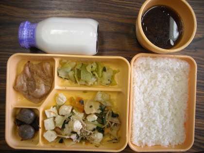 ごはん・豆腐のチャンプルー・野菜のソース炒め・鶏肉の香味焼き・