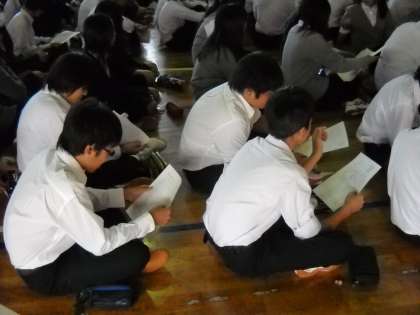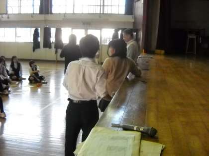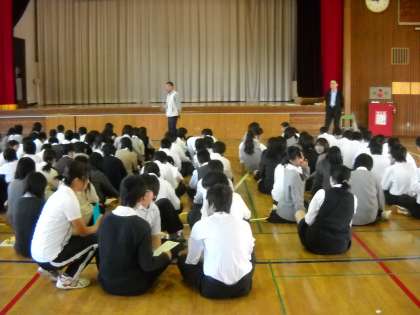 1時間目に体育館で、明日行われる職場体験の事後訪問に向けて、礼状の確認などを行いました。