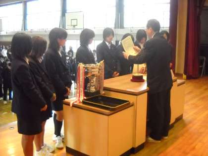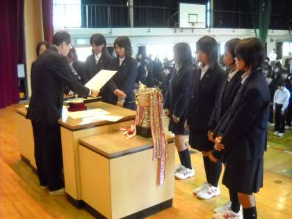 ソフトテニス部女子の、八王子市秋季大会団体と個人の優勝の表彰です。