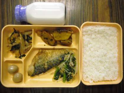 ごはん・鯖の香味焼き・青菜のナムル・大学芋・豚キムチ・うずら卵のさっぱり煮