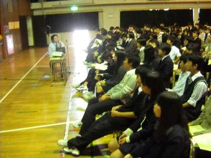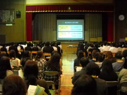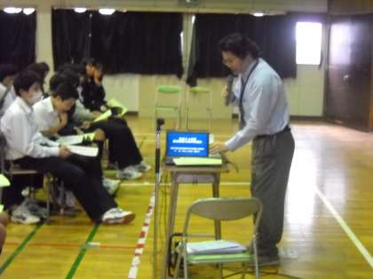 進路指導主任の竹信先生が、都立高校の受検についての説明を、プロジェクターを使って説明しました。