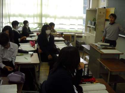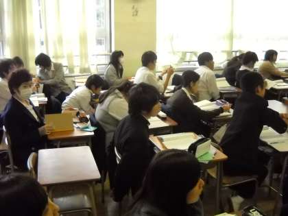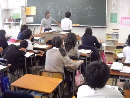 清水先生の指導で、代表生徒が黒板で難しい問題を解いていました。