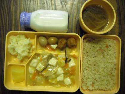 とりそぼろごはん・海鮮豆腐・チーズポテト・揚げボールと卵の甘辛煮・果物・