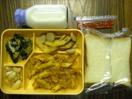 ジャムサンド・パスタカレー・ミートウィンナーとポテトのソテー・海草サラダ・