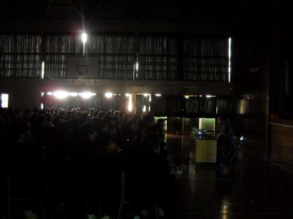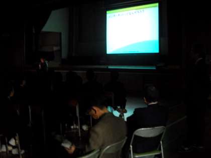 投影機を用いて、インターネットや携帯電話を扱ううえでの危険性の話をされました。