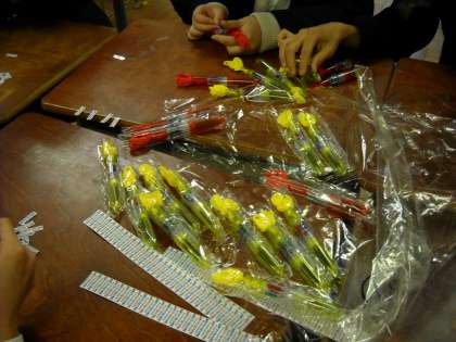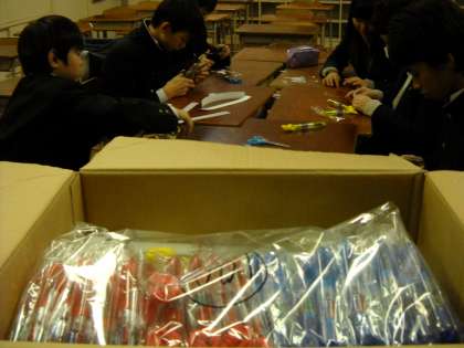 ボールペンに標語のシールをこつこつと貼る仕事です。