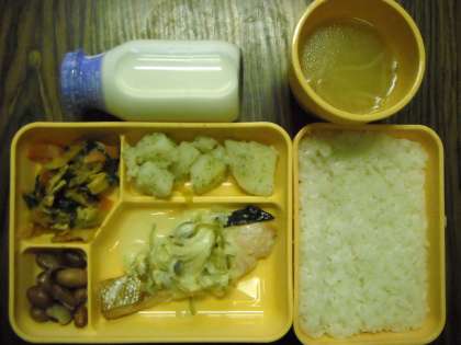 ごはん・鮭のマヨネーズソース・こふき芋・豚キムチ・金時豆の甘煮・味噌汁