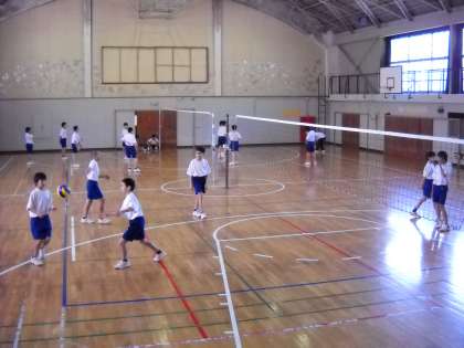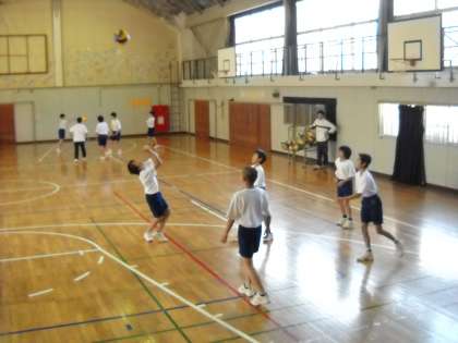 高野先生の指導で、体育館でバレーボールの授業です。