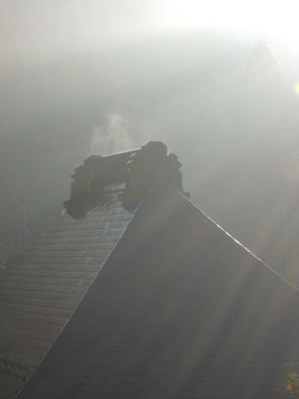朝日が昇って気温が上昇すると、皎月院の屋根から湯気が立ち昇りはじめました。