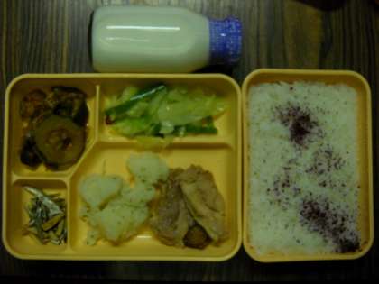 ゆかりごはん・照焼チキン・リヨネーズポテト・キャベツの辛味炒め・