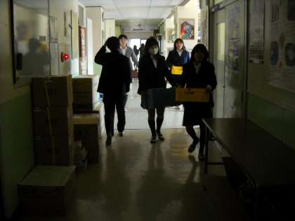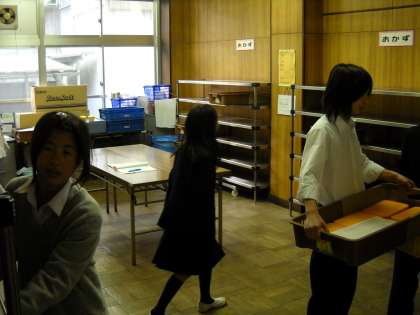 当番が配膳室に給食を取りに来ていました。