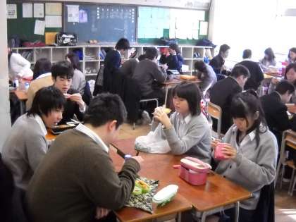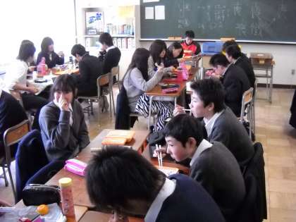 高野先生が一つ一つのおかずの味を確かめるように、給食をいただいていました。