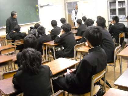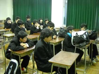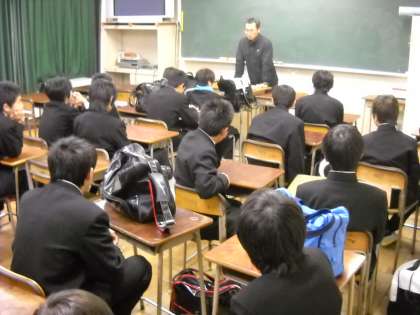 外が雨ですので、視聴覚室で秋山コーチのお話を聞いていました。