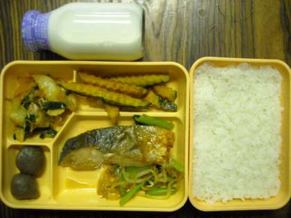 ごはん・魚のゆず味噌焼き・からし和え・あげかぼちゃ・豚キムチ・こんにゃくの土佐煮