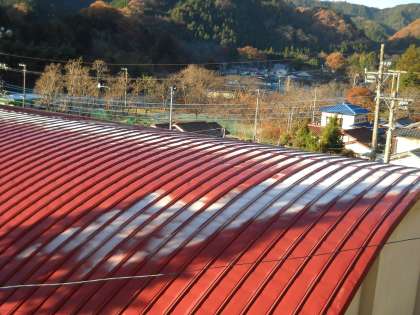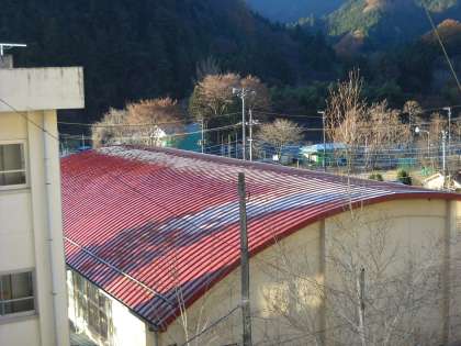 体育館にできた影の部分に屋根に、きれいに白い霜が残っていました。