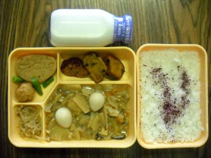 ゆかりごはん・八宝菜・大学芋・がんもどきの含め煮・なめたけ
