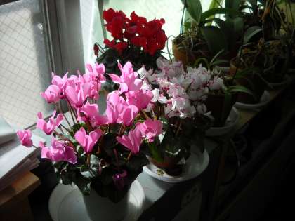冬休みに入り、職員室には、どこかの教室に飾ってあったシクラメンが移動してきていました。