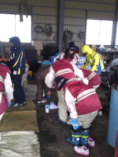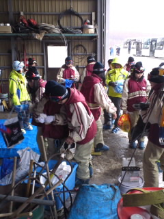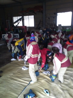 天気はみぞれなので、濡れないように倉庫の中で履き替えました。